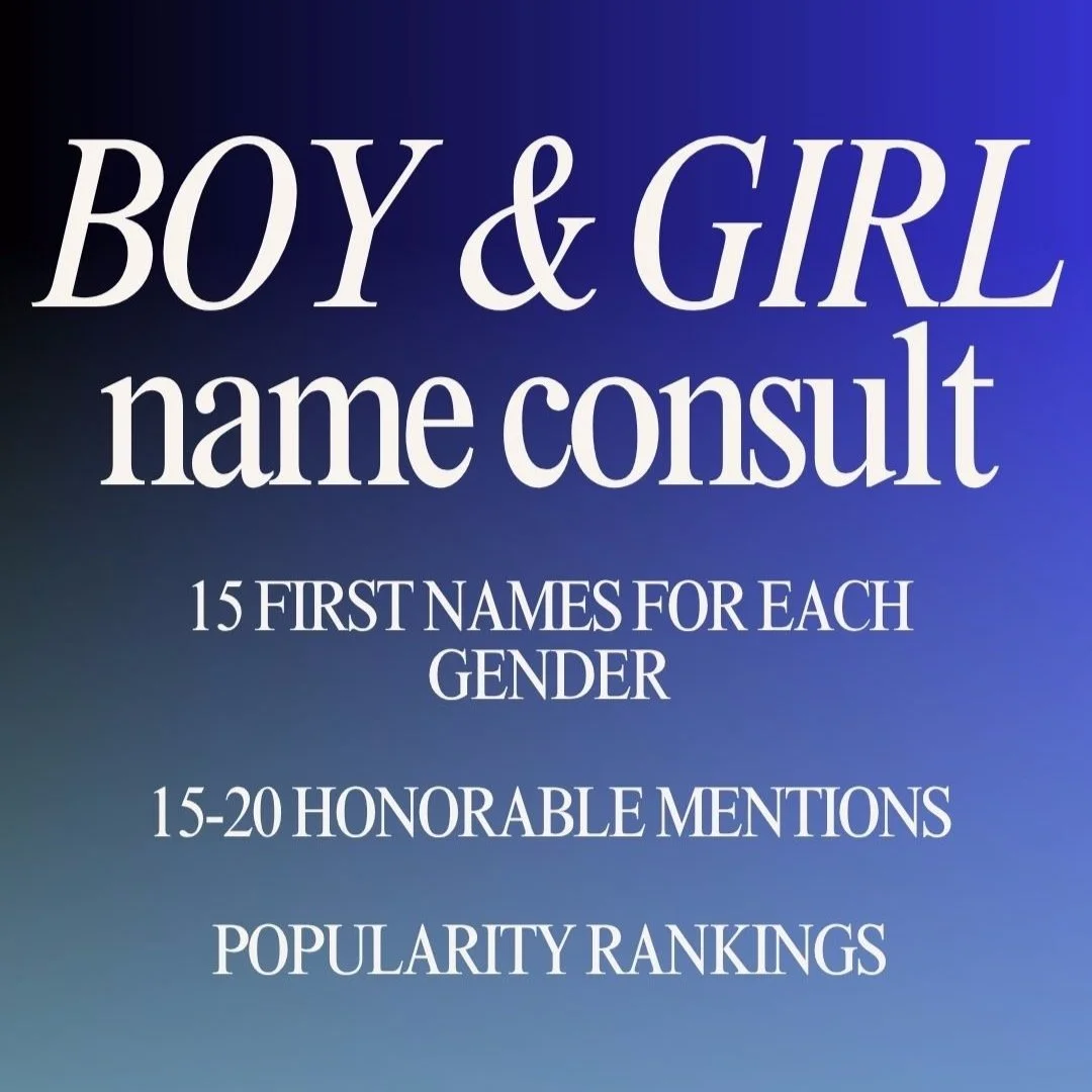 A list of 15 baby names for EACH GENDER, carefully tailored to your request. This includes first names and their popularity ranking from the 2024 US social security data. I will also include 15-20 honorable mention name options, as well as a face sheet explaining my thought process. Turnaround time is 4 WEEKS. To expedite to 1 week, select this option at checkout. To add middle names, select this add-on at checkout.